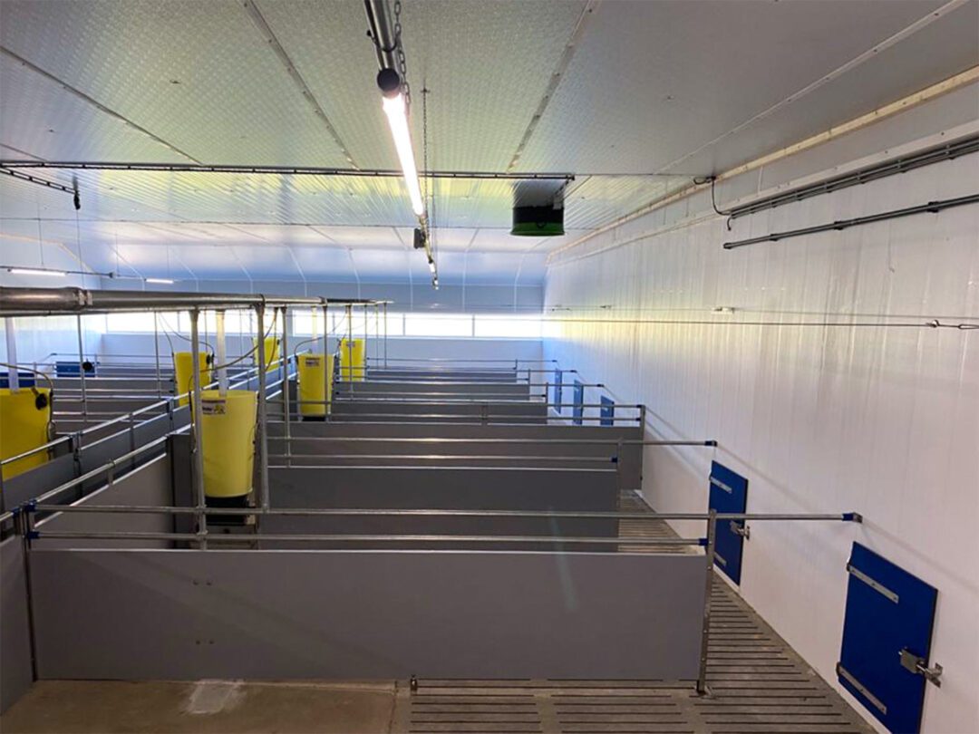 In 2021 hebben we een vleesvarkensstal ingericht met kunststof hokinrichting en Groba-groepsfeeders. Achter de groepsfeeder is een trespa poort gemonteerd om grote groepen te creëren. Door de RVS koker aan de voerbak te voorzien, ontstaat een zeer stabiel geheel.